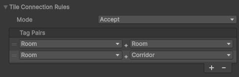 Accept: Tiles are only allowed to connect if both tiles have a tag that matches one of the defined Tag Pairs below. If a potential connection doesn't match any pair, it's rejected.Reject: Tiles are always allowed to connect unless both tiles have a tag that matches one of the defined Tag Pairs below. If a potential connection matches a pair, it's rejected.
