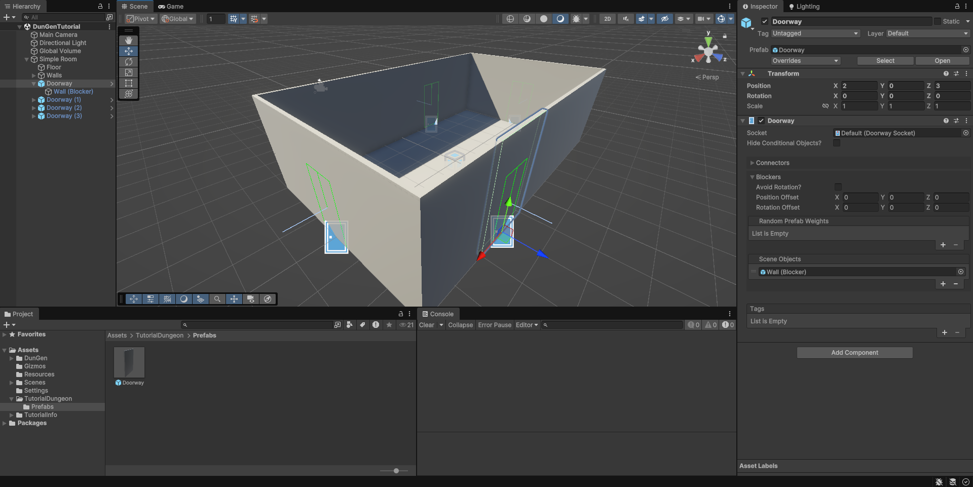Right now, DunGen can connect Tiles using your doorway—but unused doorways would leave visible gaps in the dungeon walls. To prevent this, we’ll use Blockers to automatically fill in any unused doorways.