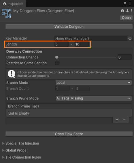 The overall length of the dungeon is not determined by the graph, and is instead set inside the Dungeon Flow asset as a range of values.